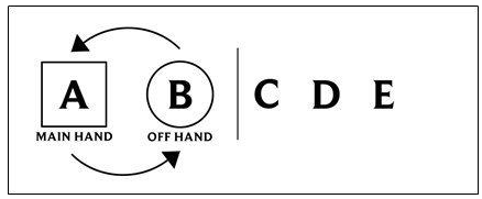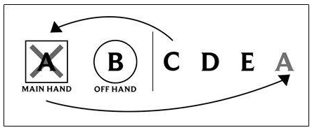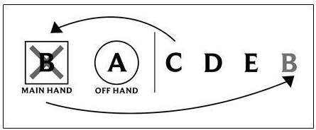 因为厄斐琉斯可以在主副手武器之间进行切换,这就导致他的武器队列顺序在游戏过程中经常改变——取决于他首先使用哪件武器。