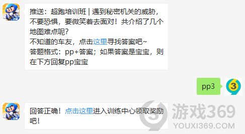 推送超跑培训班遇到秘密机关的威胁,不要恐惧,要微笑着去面对!共介绍了几个地图难点呢?答题格式:pp+答案,11月27日跑跑卡丁车每日一题的答案是什么?不知道的车主宝宝们,进来看看正确答案吧!回答正确即可领取皮蛋为大家准备的丰厚奖励了