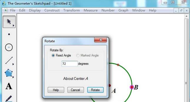 2.鼠标双击点A,标记为旋转中心。接着选中点B,单击菜单栏“变换”——“旋转”,在弹出的对话框中设置旋转角为72°。