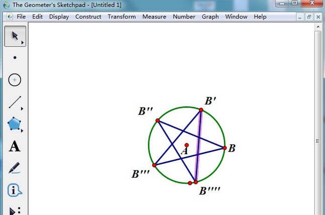 3.选中旋转生成的点,同样把它绕A点旋转72°,继续旋转,直至圆被分成五等分(注意区分圆上的一点和这五个点);