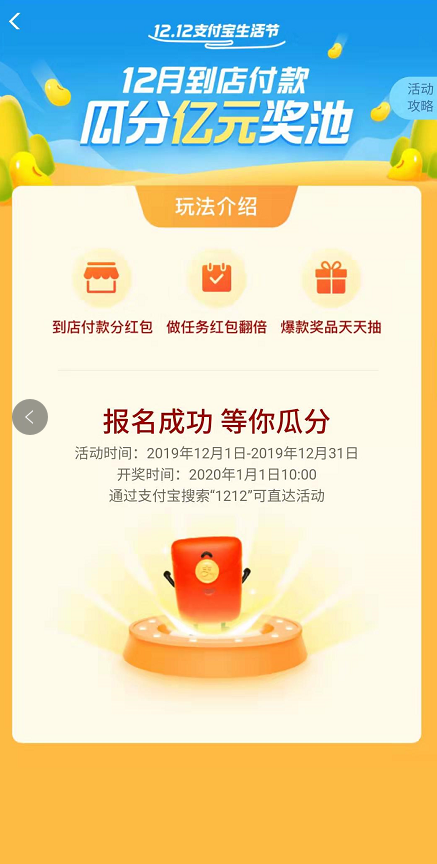 4、报名成功之后,我们在2019年的12月1日到2019年的12月31日之间即可参与活动哦!获得更多的翻倍豆将红包接翻倍。