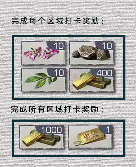 完成每个区域的打卡奖励有罗马布*10、锥纹石*10,榆树叶*10、金条*400。