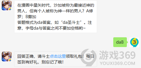 在漫画中星矢时代,沙加被称为最接近神的男人,但有个人被称为神一样的男人?答题格式为da答案,11月30日圣斗士星矢每日一题的答案是什么?不知道的斗士们,进来看看正确答案吧!回答正确即可领取雅典娜为大家准备的丰厚奖励了