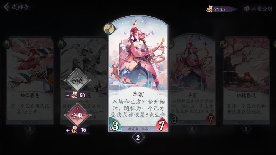 犬神的式神有犬神自身和桃花妖,只有两位式神,都为二级。虽然只有两位式神,但实力也不弱,因为只有两位式神也就意味着对手的牌库和手牌中没有其他式神的卡牌,不容易卡手,进攻节奏更紧凑。桃花妖的丰实形态也能持续给犬神加血,并加速犬神的成型速度。
