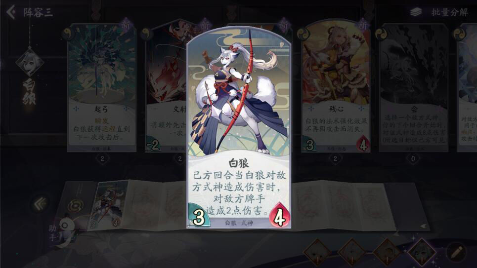 开局时尽量多地保留文射和凤鸣这两张卡牌,文射不仅能很大程度地提升白狼的生存能力,还能触发两次白狼的基础能力,配合凤鸣,能对敌方牌手造成很高的伤害。 对战时适当地忽略场面控制,想尽一切办法攻击敌方牌手,毕竟20点生命值不算太多,还是能比较容易赢得比赛的。