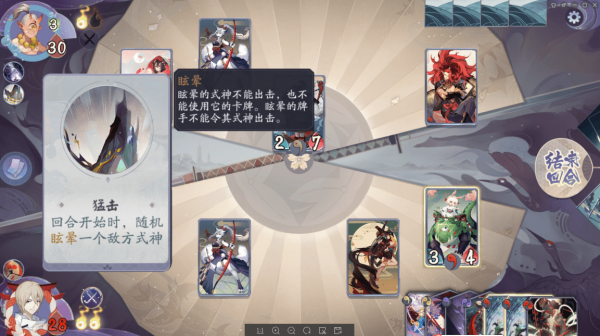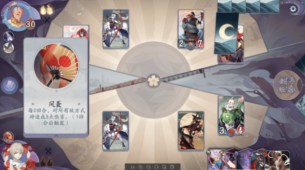 我方牌手的被动技能是“风袭”,效果为每2回合,对所有敌方式神造成3点伤害(一回合后触发),这一关的“风袭”是加强版,触发效果多了1点伤害。这也使得敌方式神的续航能力大幅下降。我方也可以配合这一被动技能打出压制力。