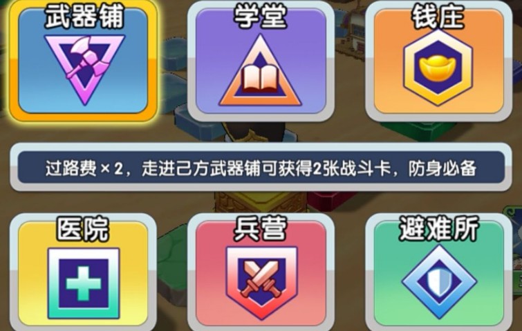 建筑物一共有六种,从便宜到昂贵的顺序为:学堂,武器铺,兵营,医院,避难所,钱庄。关于建筑物的选择,战斗型武将前期建学堂,增强行动力实现正向运营,发挥出作战强力的特点;策略型武将前期建武器铺,通过战斗卡成果过渡到后期。另外,独占和钱庄都会使过路费四倍。