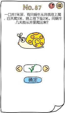 脑洞大神第87关怎么通关?有很多玩家小伙伴对这个很不解,游戏中大量原创谜题,答题消耗体力,体力需要通关时间恢复,这款脑洞游戏和好玩关键是不会弹广告,闲散时间玩一玩挺合适的,大量的关卡等你来挑战,难度越来越大,非常具有挑战性,那么快和小编一起来看看这篇问蜗牛几天能从井里爬出来通关步骤一览,相信能够帮助到有需要的玩家。
