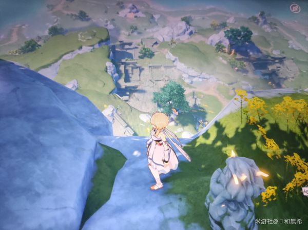 然后仔细辨别地图上的方向和景物,分别是废墟、雪山、浮空岛、和璃月城依次的位置是: