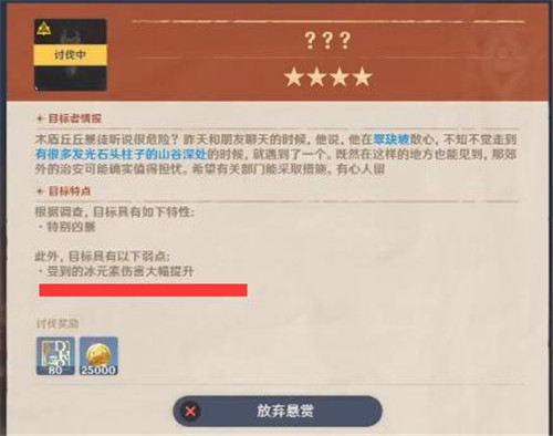 看下悬赏的目标特点,比如这只怪受到冰元素伤害大幅提升,我们就可以用冰属性人物打它。