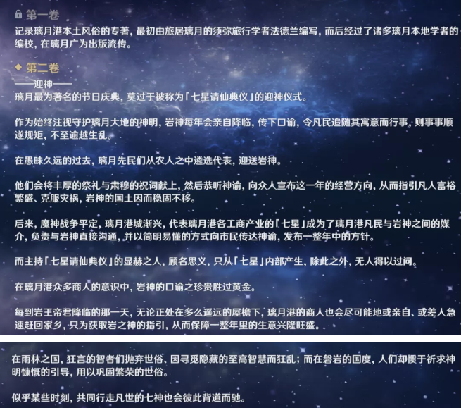在凝光的桌子上我们可以发现一本璃月风土志迎神。因为后面剧情里群玉阁会直接被炸掉,所以这本书一定不要错过。现在书籍都可以在呼出的派蒙菜单里的图鉴里面查询(需要已经收集解锁),不在显示在背包中。这本书籍的内容见下,方便没有看过的小伙伴欣赏。