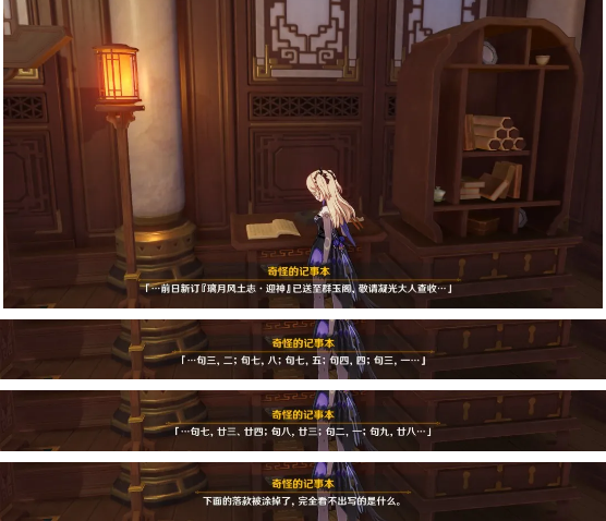 我们继续在室内探索(搜刮),可以在旁边的架子上看到奇怪的记事本,里面提到我们刚才收集的书籍是刚刚送到群玉阁的,后面还有神秘的字符,看上去是密码。