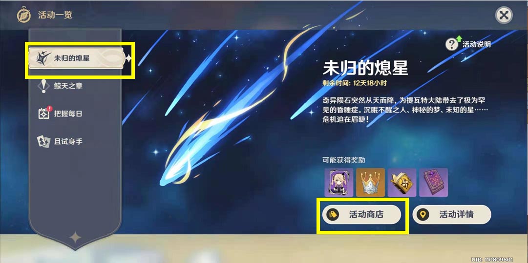 2、进入未归的熄心一栏,点击活动商店按钮;
