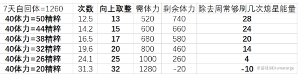 注2:除去周常够刷几次熄星能量的计算方法:[剩余体力-180(龙/狼/公子)]/20