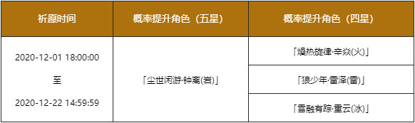 ● 活动期间内,限定五星角色「尘世闲游钟离(岩)」的祈愿获取概率将大幅提升。