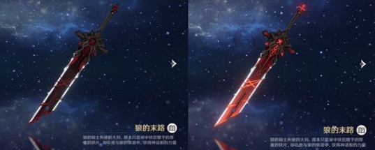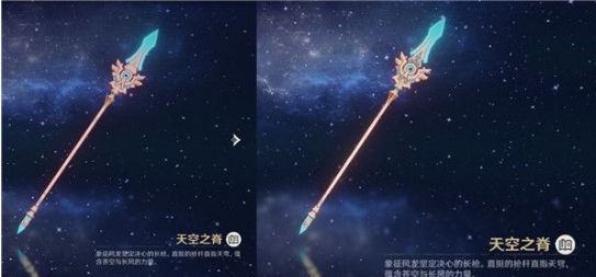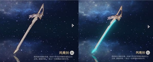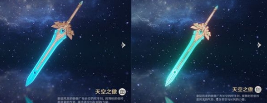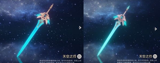 天空系列武器,突破后色彩变得更加明亮,熠熠流光,剑刃和剑柄的颜色都升华为如天空般存粹洁净的蔚蓝,更加凸显出其天空之名。