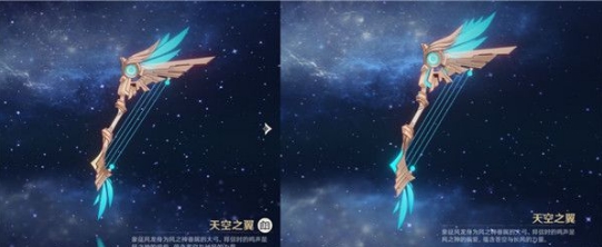 天空系列武器,以竖琴为原型的一把弓箭,突破前后变化不太明显,仅三处发光,不过其本身以琴为弓很有创意,美丽而迷人。