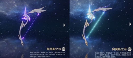阿莫斯之弓应该是突破后变化最大的,突破后整体色调由紫色化为蓝色,弓上的花纹也更加突出,色彩更分明。从原来的神秘感变得更显惊艳,结合简介更有种在痛苦中寻觅光明的蜕变之感。