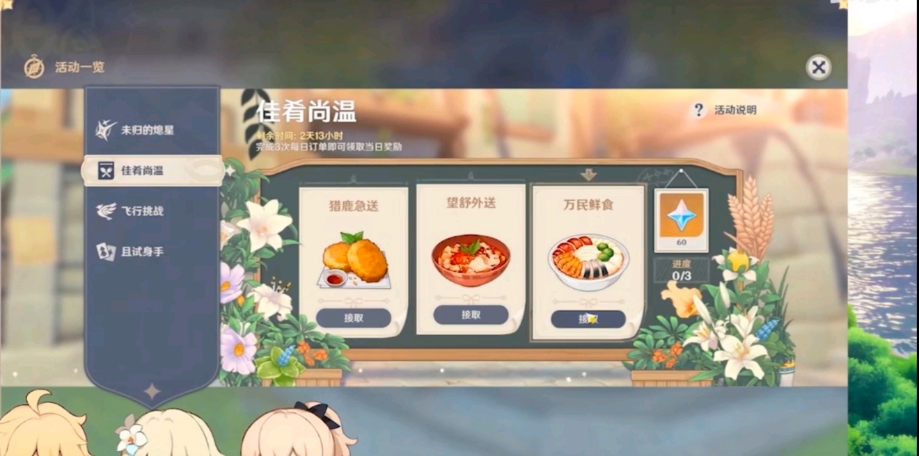 活动规则:在活动期间内,旅行者可以在猎鹿人莎拉、望舒客栈言笑、万民堂卯师傅处接受递送食物的限时订单。