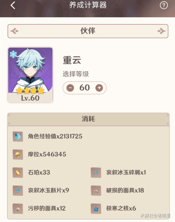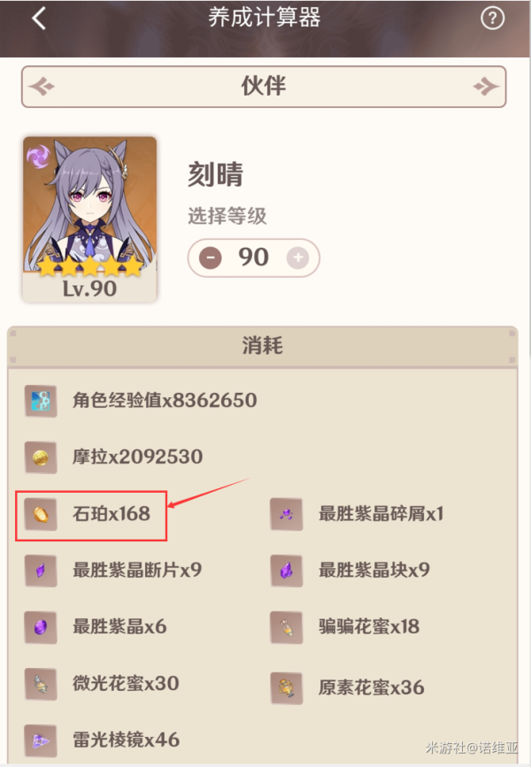 注:因为岩神瞳共鸣石的需求不一,在这不计算用于合成岩神瞳共鸣石的石珀数量举列,刻晴作为主C,升90级 要168个石珀; 重云作为上阵工具人,需求60级,只要33个即需求量为168+33=201个,更多的细节,大家可以用米游的养成计算器自行计算!