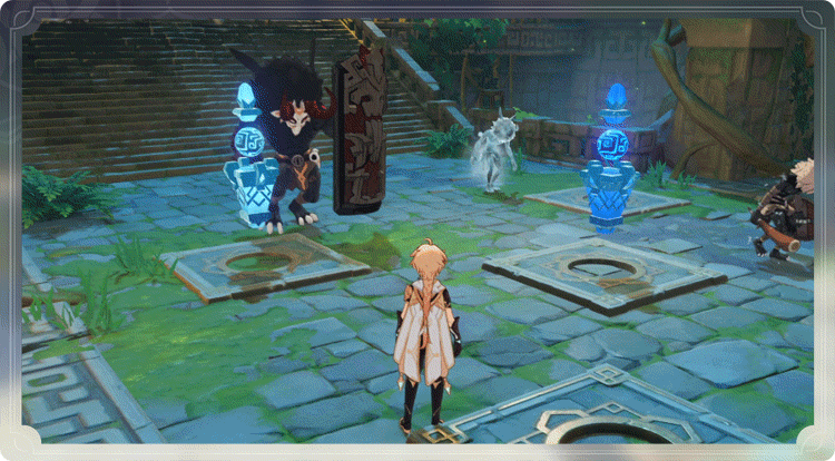 岩属性主角使用元素战技制造的荒星可以形成路障,阻碍中型、大型魔物前进,以此为机关争取更多的输出时间。在狭窄的通道内,以三颗荒星并列一排可以拦住持盾大丘丘、岩盔王、遗迹守卫等魔物的步伐,但不能阻碍普通丘丘人、丘丘人萨满等小型魔物。在往后高难的棋阵中,设置路障同样具有战略意义。