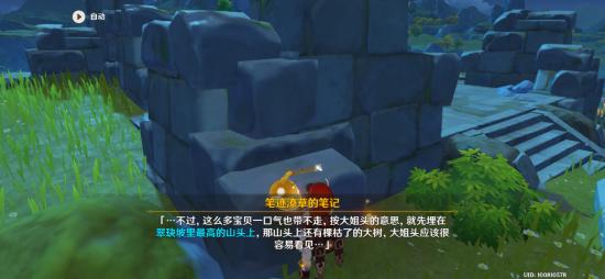 4、消灭完盗宝团,继续查看篝火旁边的1本日记,得知宝藏在翠玦坡最高峰的大树下;