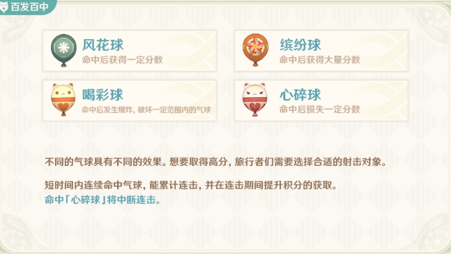 风花节期间,旅行者们可以通过活动界面的指引,寻找「百发百中」的庆典看板。旅行者们需要通过连续命中正确的气球,来获取积分。当时间耗尽时,挑战结束,结算本局积分。