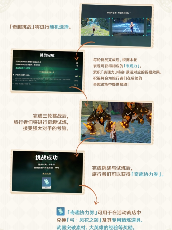 挑战开启后,旅行者们需要完成3轮随机的奇趣挑战和1轮奇趣试炼。