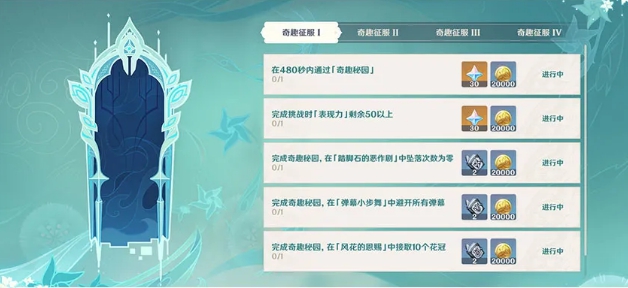 此外,完成奇趣征服中的任务,还可以获得原石、天赋培养素材、摩拉等奖励。旅行者们可以在活动界面查看奇趣征服的任务详情。