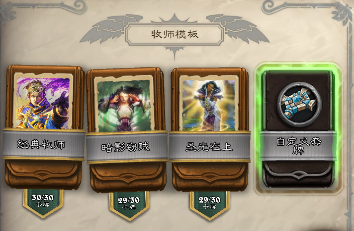炉石传说官方给玩家一共准备了三套牧师预组卡组。分别是【经典牧师】、【暗影窃贼】和【圣光在上】。但这几套预组卡组在当前环境中的强度都不高,面对中速和快攻很难翻转场面。2014年环境的牧师卡组,50%胜率以上的只有下面带来的这套环牧。