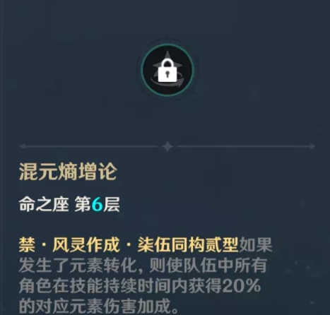 命座价值一般,砂糖大招的染色一般和输出的元素不同,染色是为了和输出的元素打反应,因此主c吃不到加成,但是当大招染错色(比如想挂冰却染成火)的时候起码还能为主c输出提供一个保底的伤害提升。6命效果与挂元素反应冲突,提供20元素伤害加成也不算多。