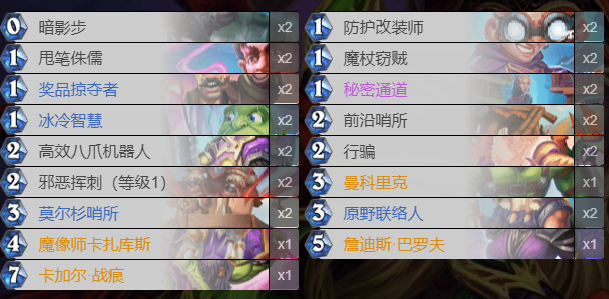 哨所贼是最早开发出来的强势卡组之一,其本质还是节奏贼,前期用哨所和甩笔侏儒、奖品掠夺者控制住节奏,中期用詹迪斯巴罗夫、魔像师卡扎库斯和卡加尔战痕的至少四波爆发压死对面,并用甩笔侏儒和邪恶挥刺来终结。有一些玩家喜欢携带赤烟腾武来加强中期爆发,我认为也比较合理,尤其是在内战较多的环境中,多一波腾武引导的爆发往往意味着多个回合的主动权。