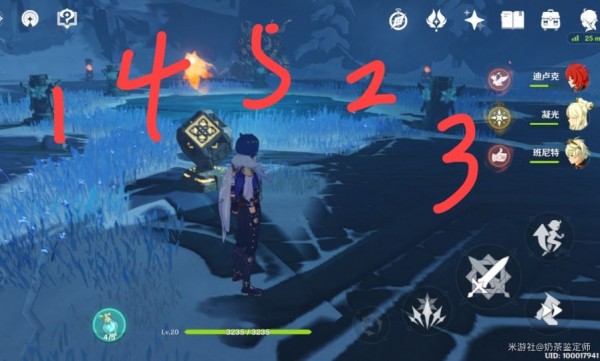 开启机关后,需按照仙灵经过的顺序激活冰元素方碑,并消灭苏醒的遗迹守卫与遗迹重机。仙灵路径见下图所示顺序: