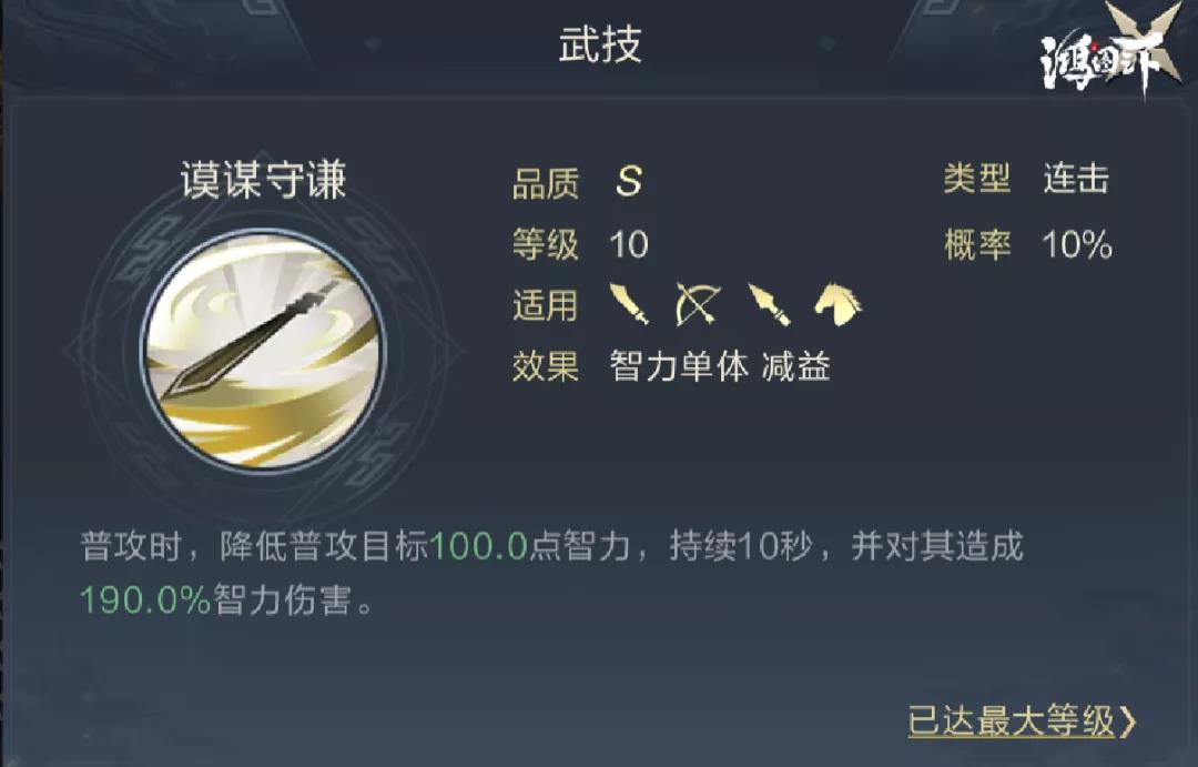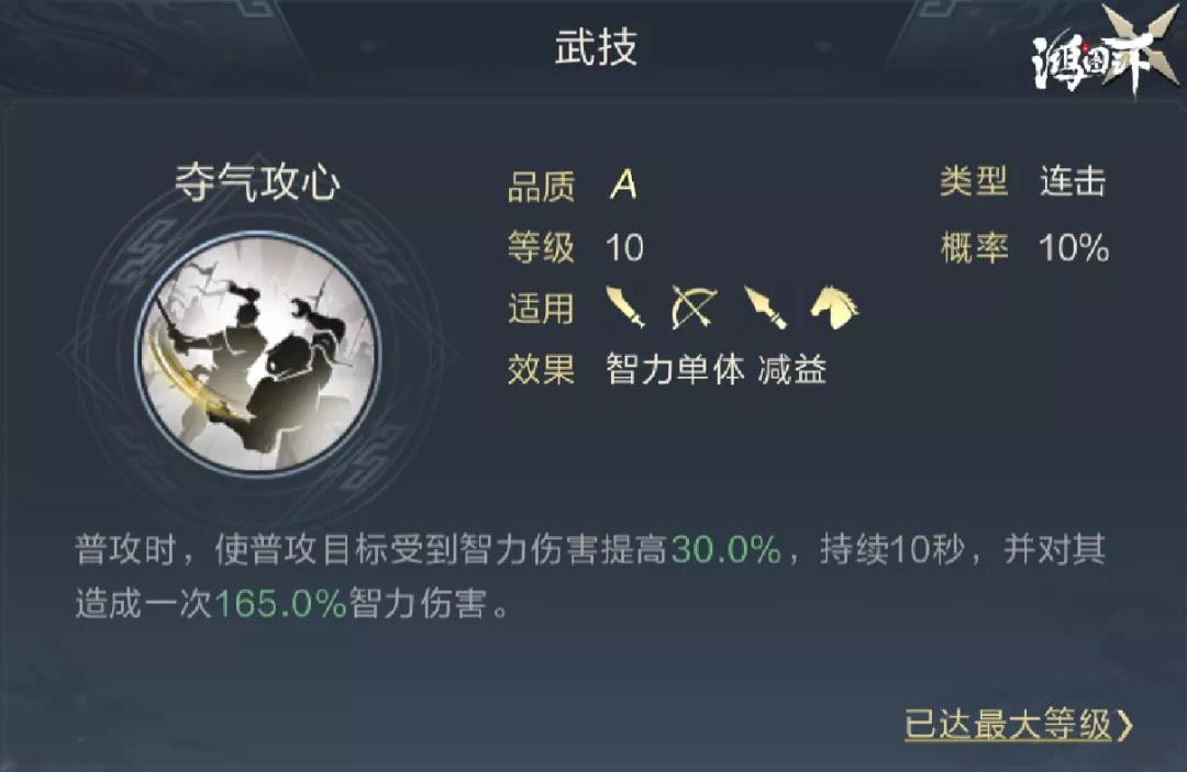 2号武技推荐夺气攻心,这个技能的效果类似智力版的贯颐奋戟,可以提高目标受到的智力伤害,配合谟谋守谦使用效果奇佳。