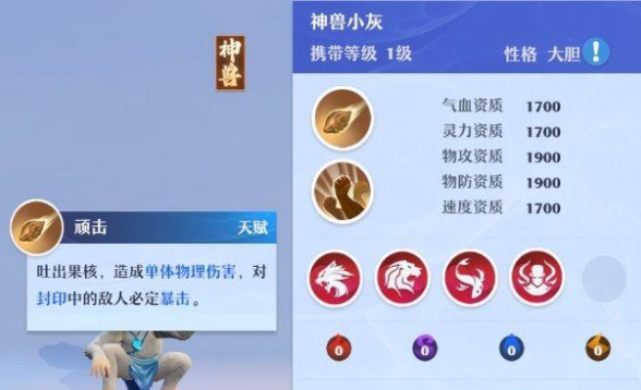 对于游戏前期来说,神兽的资质无疑是非常顶级的,到了中后期,也算得上中上水平的资质。神兽小灰的1技能,可以用来培养成封系职业的单秒宠。其2技能,也可以适合大多说职业培养成群攻宠。这里只讲专属与封系职业在pvp中用于单点秒杀的神兽小灰技能搭配推荐(仅代表个人观点,不喜勿杠)