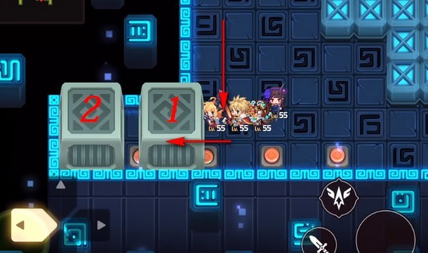 首先将第一个箱子直接往前推到最里面,压住按钮;