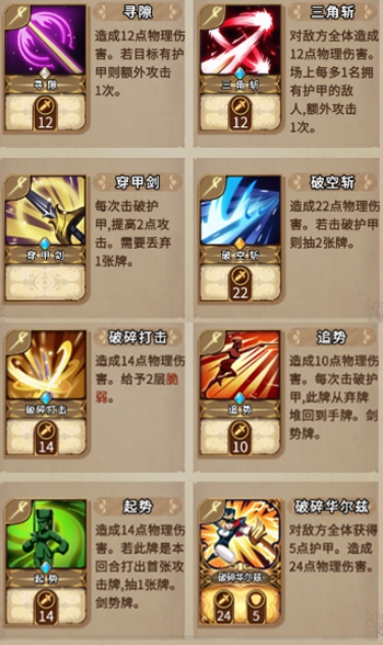 三角斩:对敌方全体造成12点物理伤害,场上每多1名拥有护甲的敌人,额外攻击1次。