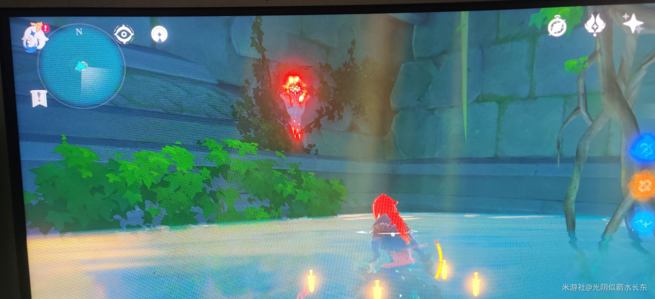 火也不难,沿着精灵停下的柱子旁的树干往上走到差不多的地方,用安柏射一下就好。