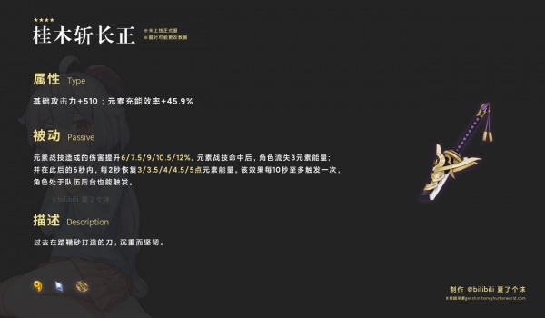 桂木斩长正满级后可以提供基础攻击力+510,元素充能效率+45.9%,令装备的角色获得最大限度的实战属性。