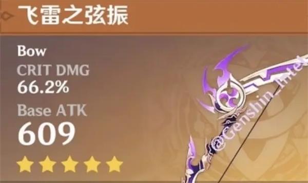 飞雷之弦振是一款五星级的武器,90级时可以提供608点基础攻击力、66.02%的暴击伤害。同时,特效上可以提供攻击力提高20%,并获得飞雷之巴印的威势,而威势可以在持有1/2/3层飞雷之巴印时,普通攻击造成的伤害提高12/24/40%。