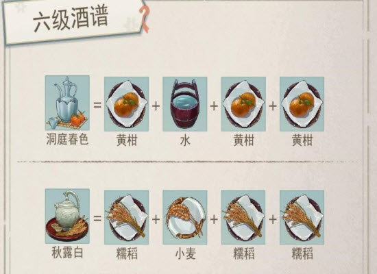1、那么我们要制作六级的酒谱,首先就要了解六级酒谱的内容,只有有了这些材料组合之后我们才能够制作出来,第一个是洞庭春色,大家在制作的时候需要准备三份黄干以及一份水。