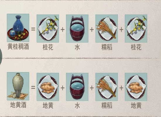 5、第四种是地黄酒,地黄酒需要大家准备两份地黄以及一份糯米稻和一份水,在这里地黄需要在第一个和最后一个分别进行放置。第五种酒品花雕酒,花雕酒需要大家准备三份糯米到以及一份水,水需要在第二个位置放置进去。
