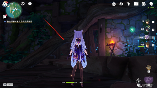 小孩就在房顶上,然后根据小勐的说法,找到村头丘丘人挖的小破车!