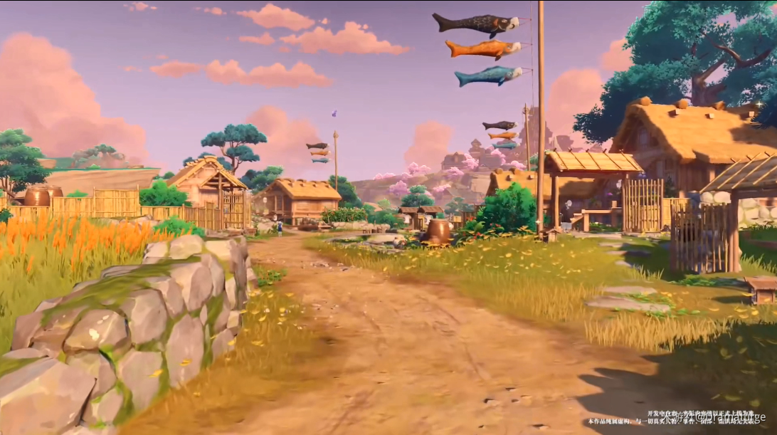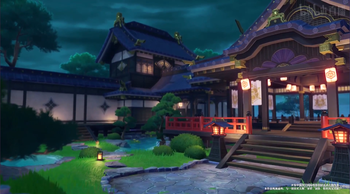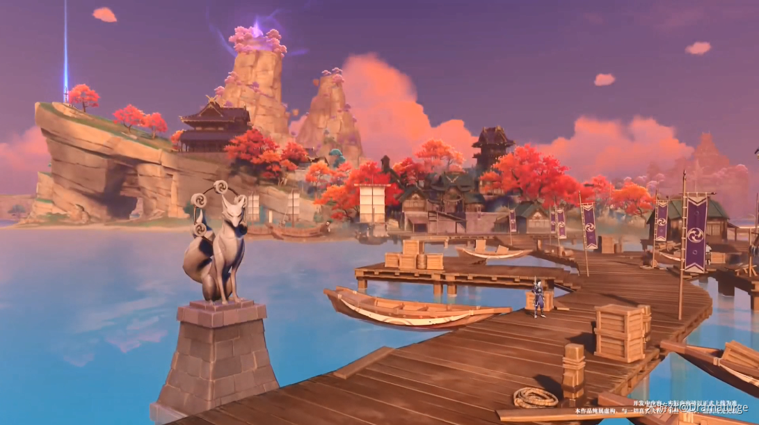 在真正路上稻妻的土地之前,一定会看见的景象。耸立在山巅的「鸣神大社」与神樱,以及滨海的稻妻城。鸣神大社与神樱耸立山巅,稻妻城居于滨海。