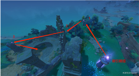 调整完毕后,对【御引磐座】进行共计即可使之发射雷电,通过【雷承之鉴】之间的相互传递即可击破该处的保护罩。
