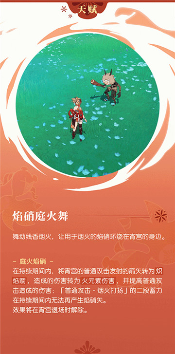 庭火焰硝:在持续期间内,将宵宫的普通攻击发射的箭矢转为炽焰箭,造成的伤害转为火元素伤害,并提高普通攻击造成的伤害,“烟火打扬”的二段蓄力在持续期间内无法再产生焰硝矢。效果将在宵宫退场时解除。