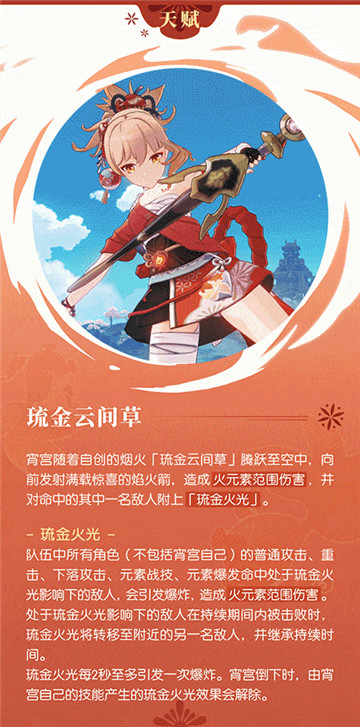 琉金云间草:宵宫随着自创的烟火“琉金云间草”腾跃至空中,向前发射满载惊喜的焰火箭,造成火元素范围伤害,并对命中的其中一名敌入附上“琉金火光”。