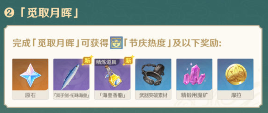 达到相应的收集进度可领取限定武器「双手剑·衔珠海皇」(咸鱼好耶!)以及其精炼道具「海皇香脂」,