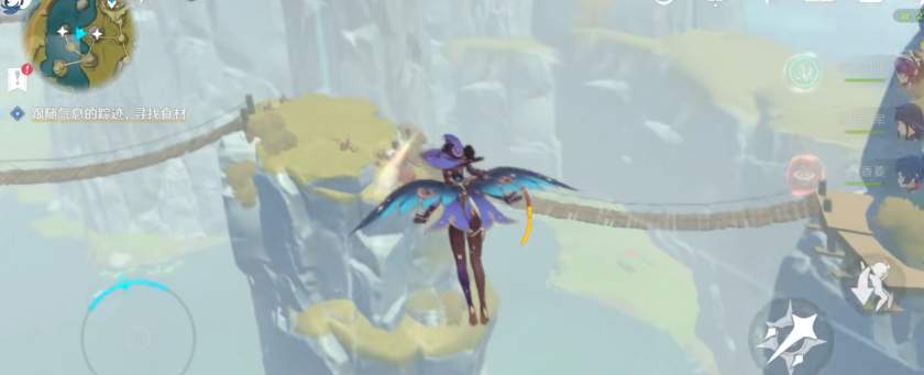 1、在与留云借风真君完成对话后,在任务区域会有金色的风痕一样的指引,沿着地图上的金光反方向飞,借助风场起飞到达下图所示的两座桥中间的山崖上。
