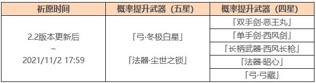 ●活动期间,限定五星武器「弓·冬极白星」「法器·尘世之锁」的祈愿获取概率将大幅提升!